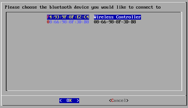 If all goes properly, you will be given a list of your nearby Bluetooth devices. Select your controller, and press Enter. Note: some PS4 controllers are identified as Wireless Controller, Sony Playstation 4 Controller, or sometimes simply the unique address of the device. If you do not see it by name, try the numbered devices.